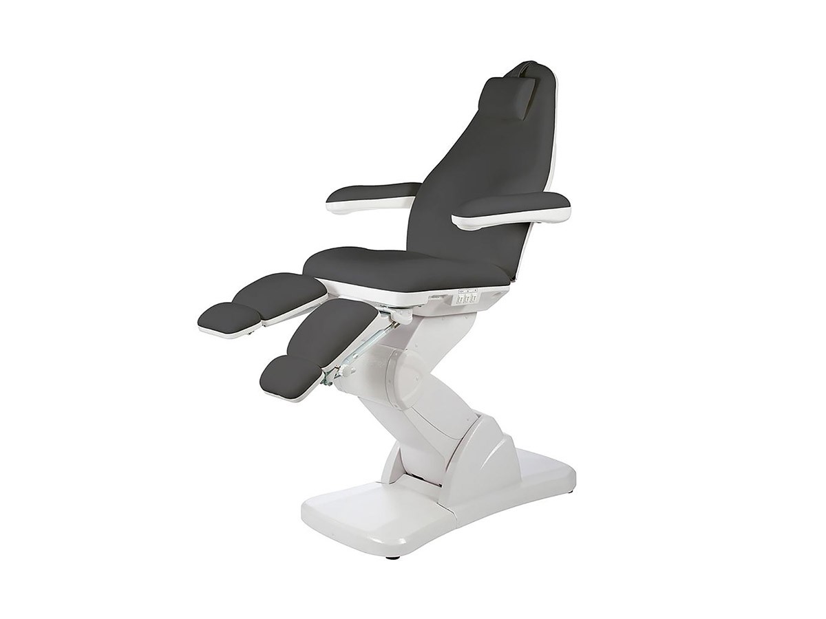 Fauteuil de pédicure électrique CUBO 5, conçu avec un revêtement en PU de haute qualité pour une résistance durable. Pour un confort optimal, il est équipé de repose-bras rabattables et d'un coussin repose-tête amovible. Les jambières sont ajustables individuellement via un vérin à gaz et peuvent s’ouvrir à 90° pour une flexibilité maximale.