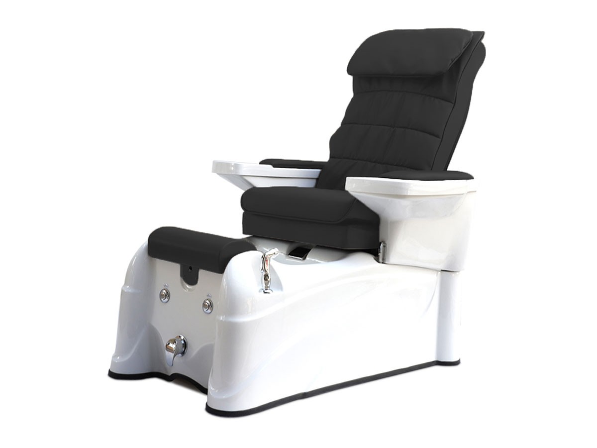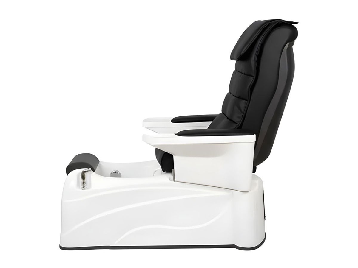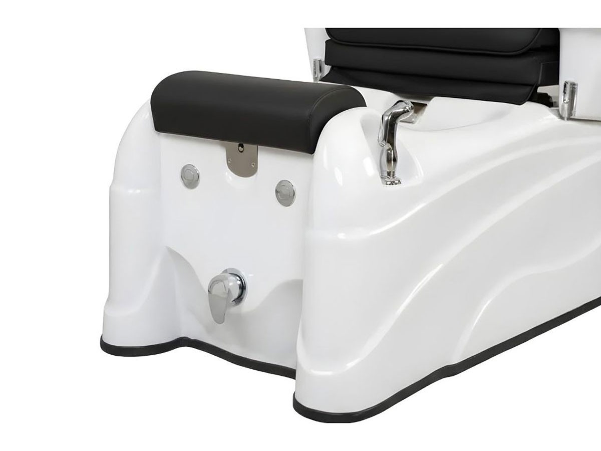 Accoudoirs pivotants avec bol de manucure, massage shiatsu et air comprimé, baignoire hydromassante avec douchette, et repose-pieds réglable offrent une expérience relaxante et ergonomique pour le client, tout en facilitant le travail du professionnel.