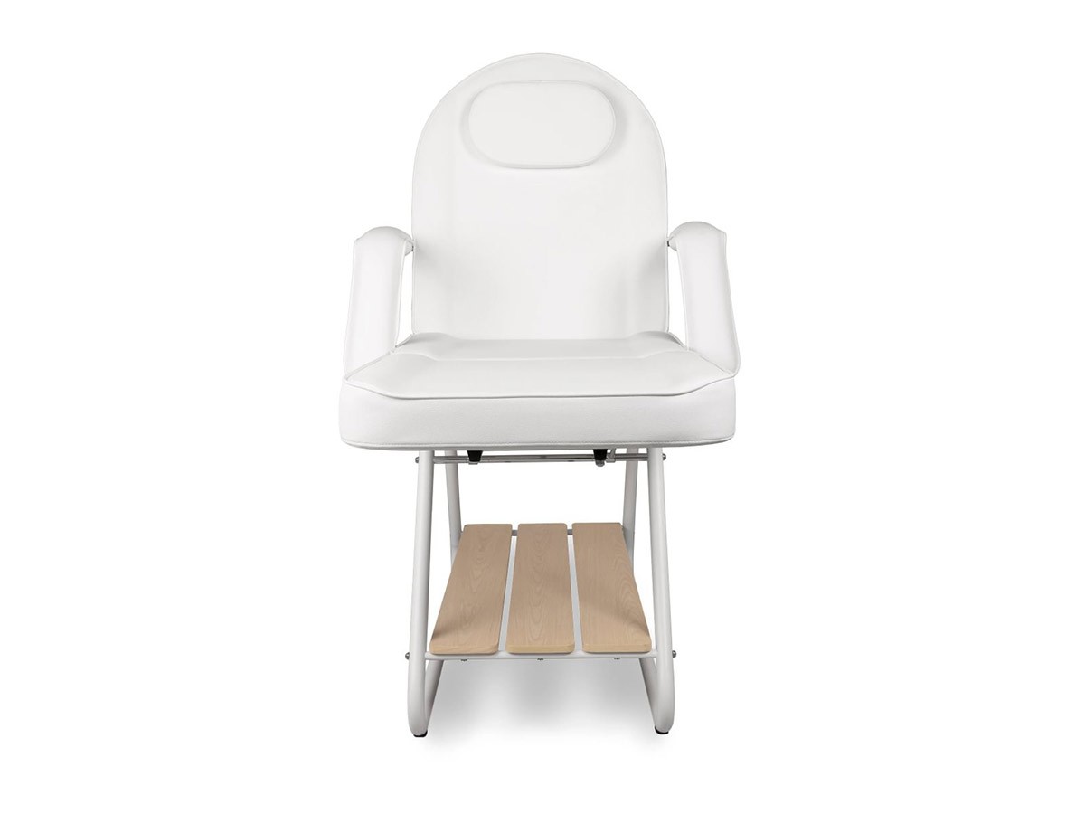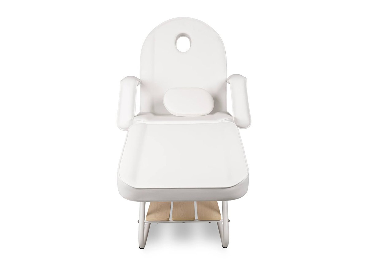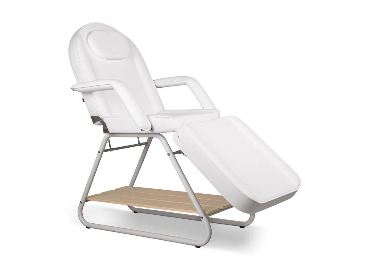 Ses réglages à crans permettent d’ajuster précisément le dossier et le repose-jambes selon le soin réalisé. Son revêtement en similicuir blanc de qualité supérieure est résistant et entretien facile. Un rangement en bois intégré sous l’assise offre une solution pratique pour garder le matériel à proximité.