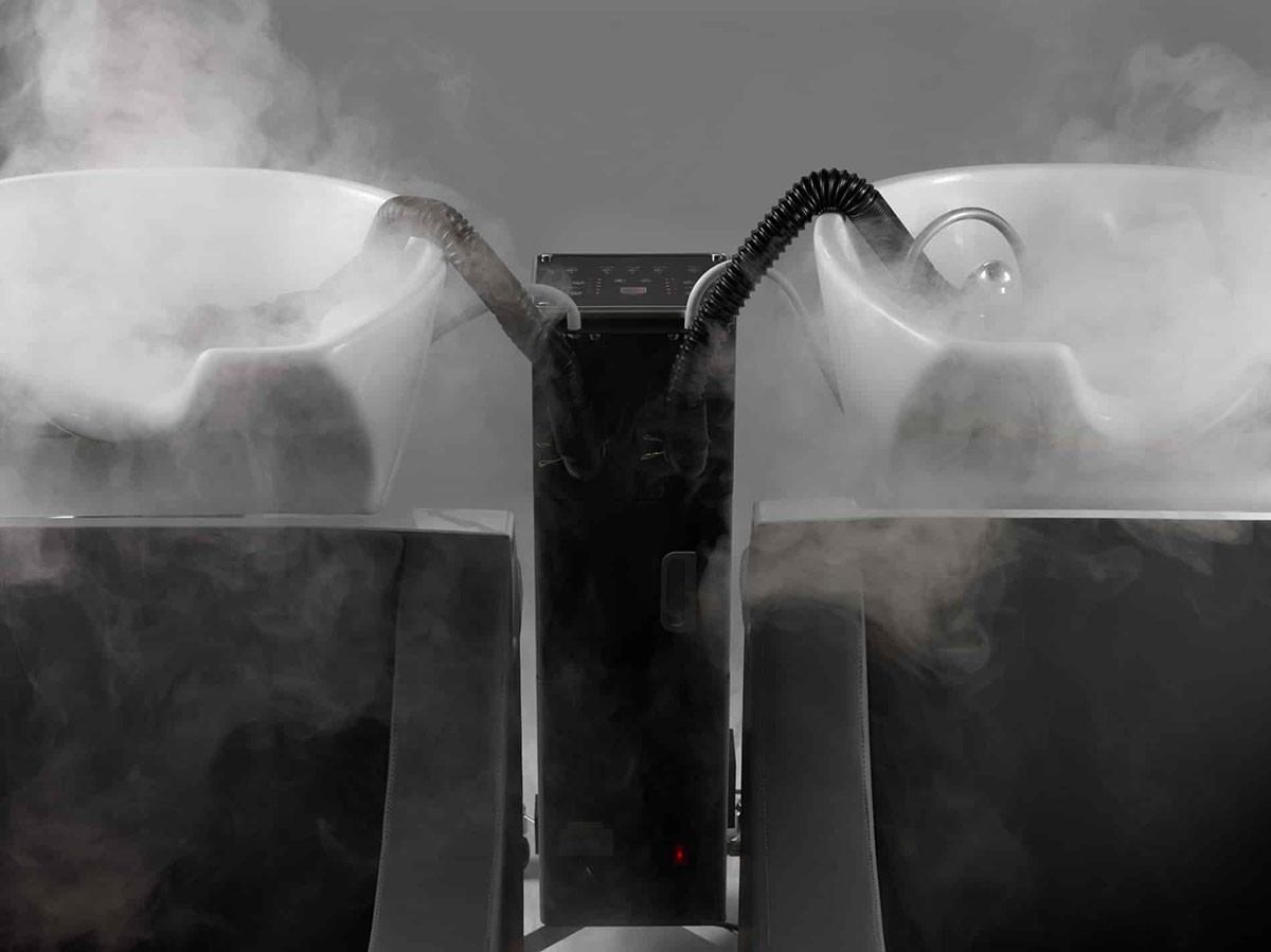 Son système de double diffusion permet une utilisation simultanée sur deux bacs de lavage, offrant un gain de temps et d’efficacité en salon.