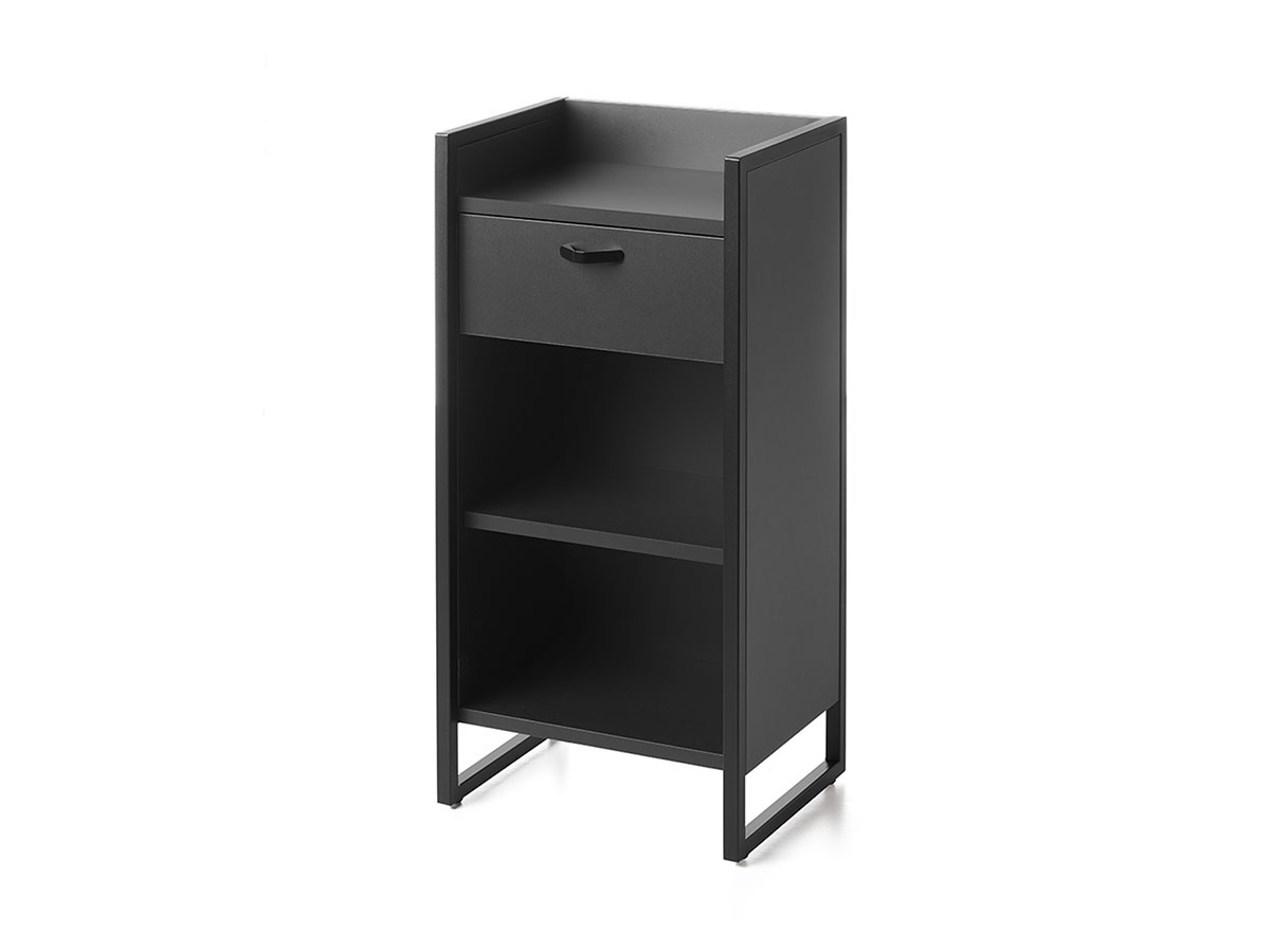 Chariot de rangement DEN, structure en métal noir et en bois stratifié, composé d'un tiroir et de deux étagères.