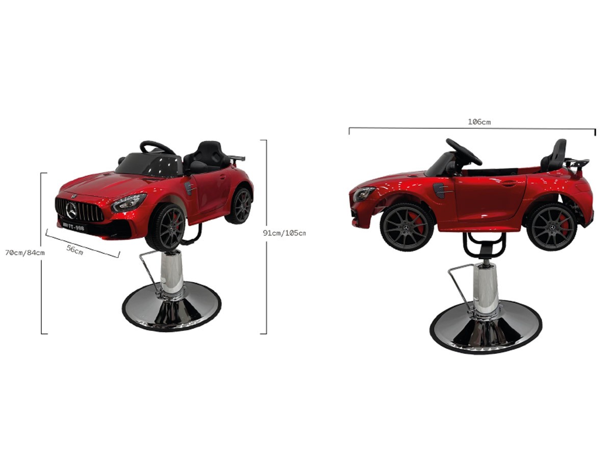 Fauteuil de coiffure enfant WAG, voiture de sport de luxe rouge avec sons et lumières intégrés, réglable en hauteur avec une pompe hydraulique, rotation à 360°.