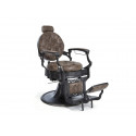 Fauteuil barbier CLINT M, structure métallique brillante travaillée avec une tapisserie en similicuir brun.