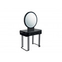 Coiffeuse en îlot 2 places NICOLE, composé d'un meuble en MDF laqué noir sur une structure en métal noir, ainsi qu'un miroir double avec un encadrement métallique noir et éclairage LED intégré.