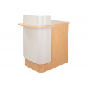 Réception d'accueil CORA DESK, dispose de grands espaces de rangements, avec portes et 2 tiroirs à clés. Structure en bois plaqué naturel avec façade blanche protectrice pour l'intimité ainsi qu'une tablette en en angle arrondi d'exposition ou à l'usage des clients.