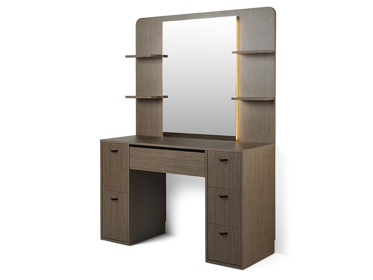 Le poste de coiffage et barbier MILO mise sur une esthétique chaleureuse et un agencement pratique. Doté d’un large miroir, de niches latérales et de rangements intégrés, il facilite l’organisation tout en mettant vos produits en valeur. Son fini bois naturel apporte une touche douce et tendance à votre salon ou barber shop. Le modèle peut également être équipé d’un éclairage LED en option pour sublimer l’ensemble.