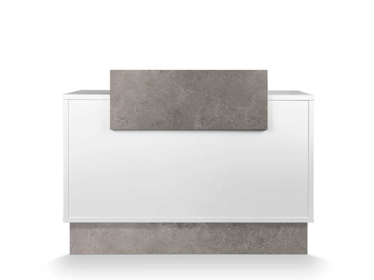 Réception caisse THIERRY 22/50, est un meuble en bois stratifié blanc + socle et comptoir effet béton ciré gris résistants aux rayures + une tablette extractible pour clavier + 4 étagères + un tiroir caisse à serrure.