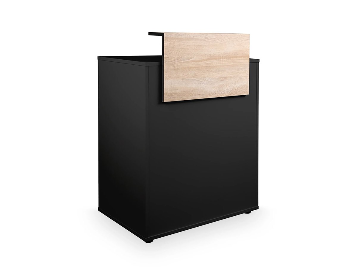 Réception caisse DYLAN 98/16, est un meuble en bois stratifié noir avec comptoir en effet bois naturel résistant aux rayures + une tablette extractible pour clavier + deux étagères + un tiroir caisse à serrure.