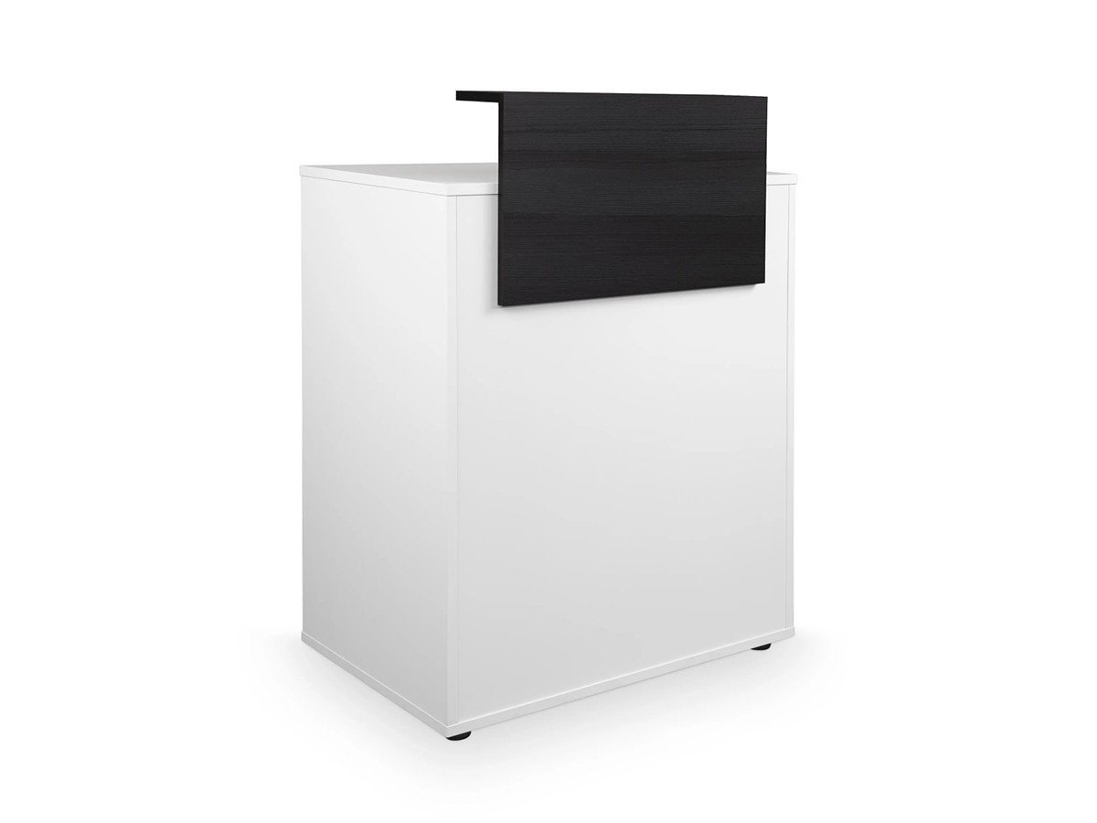 Réception caisse DYLAN 22/98, est un meuble en bois stratifié blanc avec comptoir en effet bois noir résistant aux rayures + une tablette extractible pour clavier + deux étagères + un tiroir caisse à serrure.