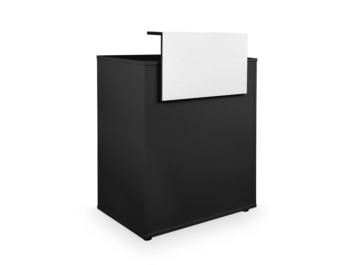 Réception caisse DYLAN 98/22, est un meuble en bois stratifié noir avec comptoir en effet bois blanc résistant aux rayures + une tablette extractible pour clavier + deux étagères + un tiroir caisse à serrure.