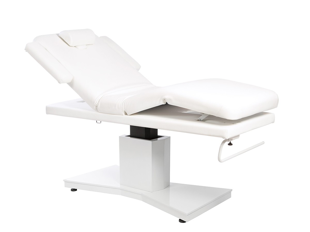 Table massage BERE, trois moteurs dirigé par une télécommande pour régler la hauteur (position à plat) : 72-90cm, l'inclinaison du dossier à 70° et 20º du repose-pieds. Des accoudoirs amovibles. Un trou le visage et le porte rouleau inclus.
